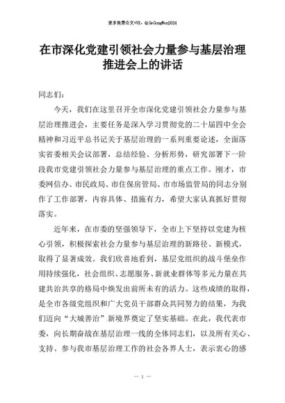 / 【七哥公文】2026年:在市深化党建引领社会力量参与基层治理推进会上的讲话+更多免费公文+VX:QiGeGongWen2024