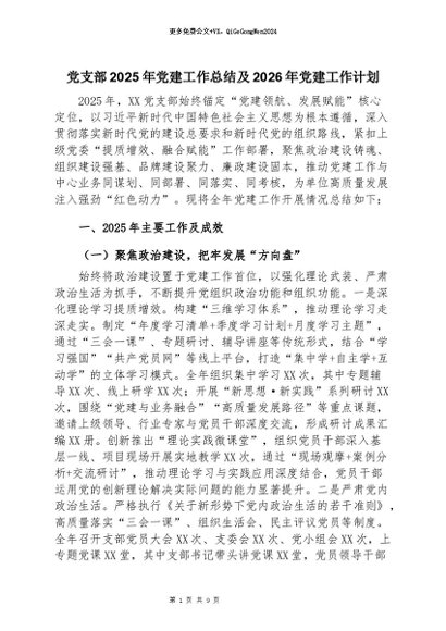 【七哥公文】2026年:党支部2025年党建工作总结及2026年党建工作计划+更多免费公文+VX:QiGeGongWen2024