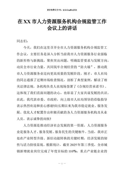 / 【七哥公文】2026年:在XX市人力资源服务机构合规监管工作会议上的讲话+更多免费公文+VX:QiGeGongWen2024