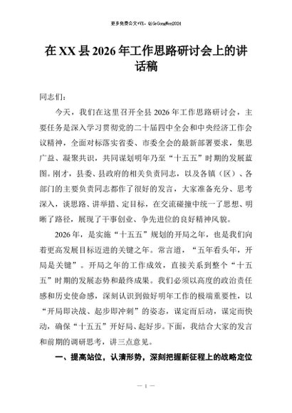 / 【七哥公文】2026年:在XX县2026年工作思路研讨会上的讲话稿+更多免费公文+VX:QiGeGongWen2024