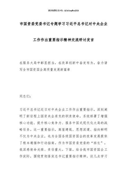【七哥公文】2026年:市国资委党委书记专题学习总书记对中央企业工作作出重要指示精神交流研讨发言_副本+更多免费公文+VX:QiGeGongWen2024