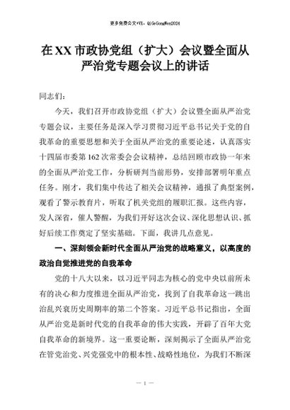 【七哥公文】2026年:在XX市政协党组(扩大)会议暨全面从严治党专题会议上的讲话+更多免费公文+VX:QiGeGongWen2024