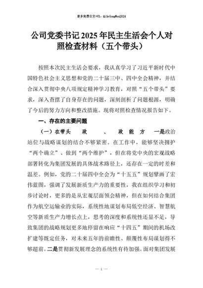 【七哥公文】2026年:公司党委书记2025年民主生活会个人对照检查材料(五个带头)+更多免费公文+VX:QiGeGongWen2024