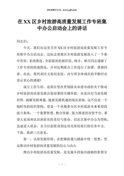 【七哥公文】2026年:在XX区乡村旅游高质量发展工作专班集中办公启动会上的讲话+更多免费公文+VX:QiGeGongWen2024