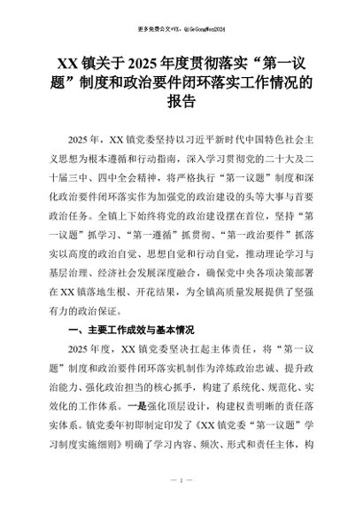 【七哥公文】2026年:XX镇关于2025年度贯彻落实“第一议题”制度和政治要件闭环落实工作情况的报告+更多免费公文+VX:QiGeGongWen2024