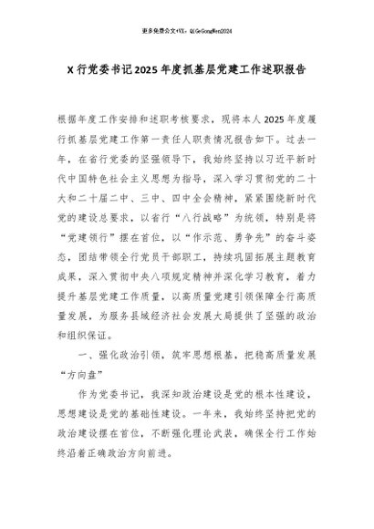 【七哥公文】2026年:X行党委书记2025年度抓基层党建工作述职报告_副本+更多免费公文+VX:QiGeGongWen2024