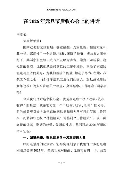/ 【七哥公文】2026年:在2026年元旦节后收心会上的讲话+更多免费公文+VX:QiGeGongWen2024