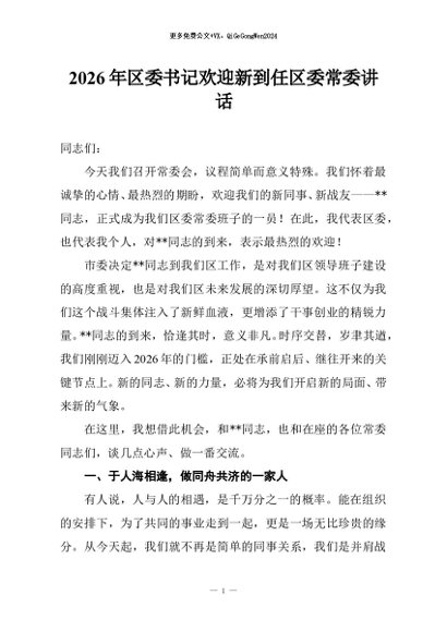 【七哥公文】2026年:2026年区委书记欢迎新到任区委常委讲话+更多免费公文+VX:QiGeGongWen2024