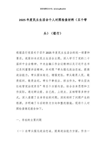 【七哥公文】2026年:2025年度民主生活会个人对照检查材料(五个带头)(银行)_副本+更多免费公文+VX:QiGeGongWen2024