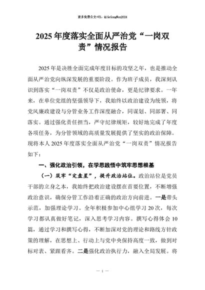 【七哥公文】2026年:2025年度落实全面从严治党“一岗双责”情况报告+更多免费公文+VX:QiGeGongWen2024
