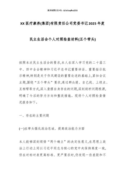 【七哥公文】2026年:XX医疗康养(集团)有限责任公司党委书记2025年度民主生活会个人对照检查材料(五个带头)_副本+更多免费公文+VX:QiGeGongWen2024