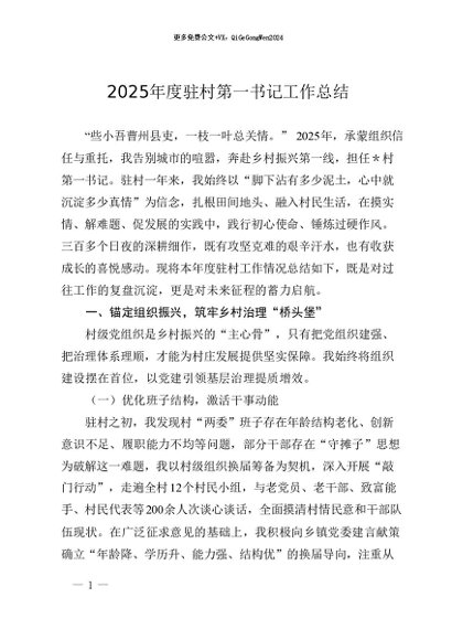 / 【七哥公文】2026年:2025年度驻村第一书记工作总结+更多免费公文+VX:QiGeGongWen2024