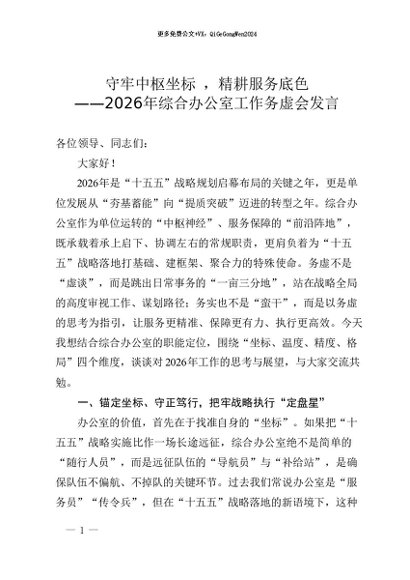 【七哥公文】2026年:2026年综合办公室工作务虚会发言:守牢中枢坐标 ,精耕服务底色+更多免费公文+VX:QiGeGongWen2024