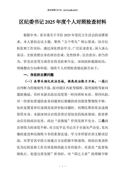 / 【七哥公文】2026年:区纪委书记2025年度个人对照检查材料+更多免费公文+VX:QiGeGongWen2024