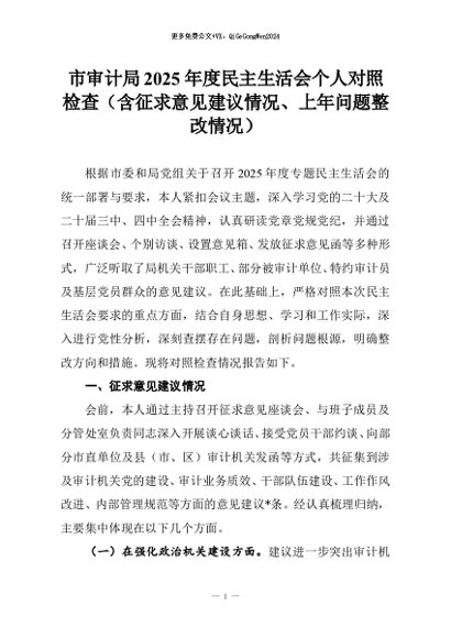 【七哥公文】2026年:市审计局2025年度民主生活会个人对照检查(含征求意见建议情况、上年问题整改情况)+更多免费公文+VX:QiGeGongWen2024