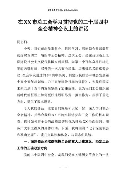 【七哥公文】2026年:在XX市总工会学习贯彻党的二十届四中全会精神会议上的讲话+更多免费公文+VX:QiGeGongWen2024