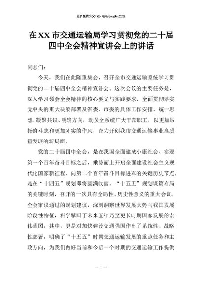 【七哥公文】2026年:在XX市交通运输局学习贯彻党的二十届四中全会精神宣讲会上的讲话+更多免费公文+VX:QiGeGongWen2024