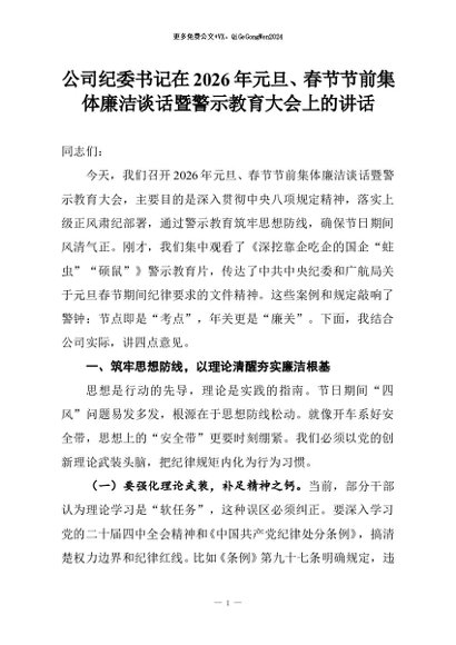 【七哥公文】2026年:公司纪委书记在2026年元旦、春节节前集体廉洁谈话暨警示教育大会上的讲话+更多免费公文+VX:QiGeGongWen2024