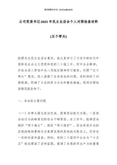 【七哥公文】2026年:公司党委书记2025年民主生活会个人对照检查材料(五个带头)_副本+更多免费公文+VX:QiGeGongWen2024