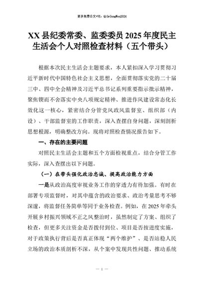 【七哥公文】2026年:XX县纪委常委、监委委员2025年度民主生活会个人对照检查材料(五个带头)+更多免费公文+VX:QiGeGongWen2024