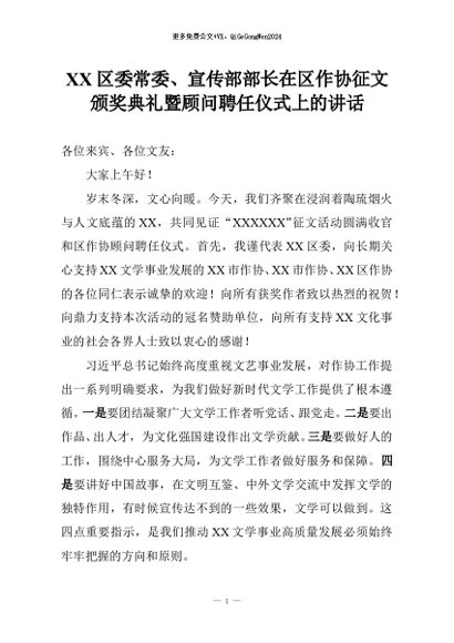【七哥公文】2026年:XX区委常委、宣传部部长在区作协征文颁奖典礼暨顾问聘任仪式上的讲话+更多免费公文+VX:QiGeGongWen2024