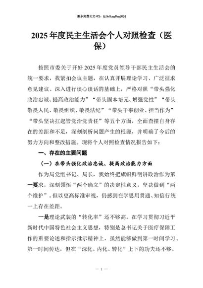 / 【七哥公文】2026年:2025年度民主生活会个人对照检查(医保)+更多免费公文+VX:QiGeGongWen2024