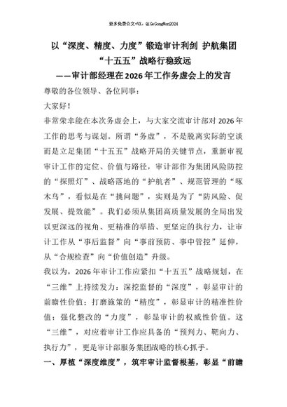 【七哥公文】2026年:审计部经理在2026年工作务虚会上的发言:以“深度、精度、力度”锻造审计利剑 护航集团“十五五”战略行稳致远+更多免费公文+VX:QiGeGongWen2024