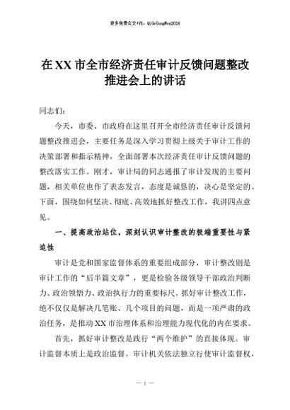 / 【七哥公文】2026年:在XX市全市经济责任审计反馈问题整改推进会上的讲话+更多免费公文+VX:QiGeGongWen2024
