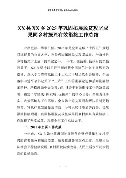 【七哥公文】2026年:XX县XX乡2025年巩固拓展脱贫攻坚成果同乡村振兴有效衔接工作总结+更多免费公文+VX:QiGeGongWen2024