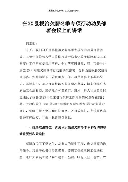 【七哥公文】2026年:在XX县根治欠薪冬季专项行动动员部署会议上的讲话+更多免费公文+VX:QiGeGongWen2024