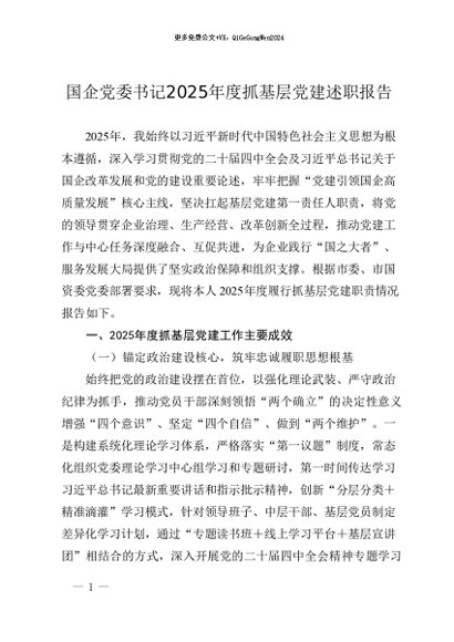 / 【七哥公文】2026年:国企党委书记2025年度抓基层党建述职报告+更多免费公文+VX:QiGeGongWen2024