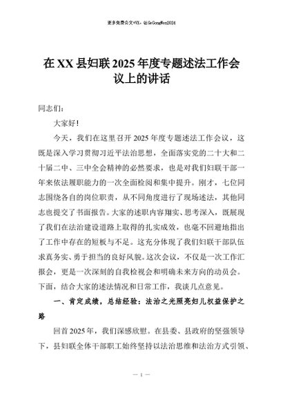/ 【七哥公文】2026年:在XX县妇联2025年度专题述法工作会议上的讲话+更多免费公文+VX:QiGeGongWen2024
