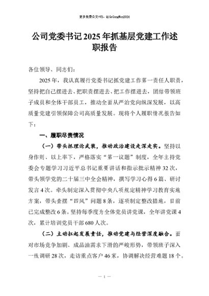 / 【七哥公文】2026年:公司党委书记2025年抓基层党建工作述职报告+更多免费公文+VX:QiGeGongWen2024