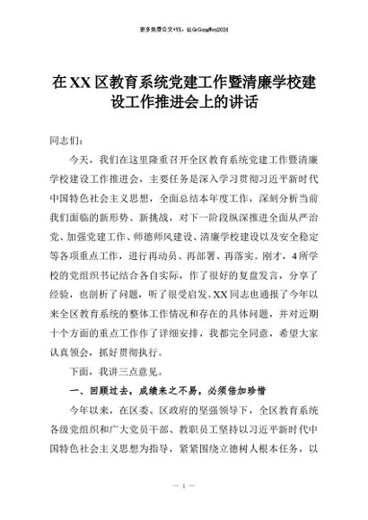 【七哥公文】2026年:在XX区教育系统党建工作暨清廉学校建设工作推进会上的讲话+更多免费公文+VX:QiGeGongWen2024
