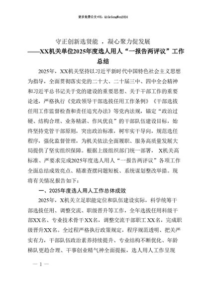 【七哥公文】2026年:XX机关单位2025年度选人用人“一报告两评议”工作总结:守正创新选贤能 ,凝心聚力促发展+更多免费公文+VX:QiGeGongWen2024