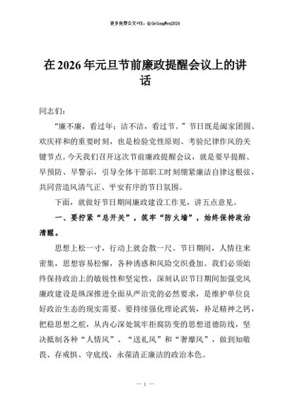 / 【七哥公文】2026年:在2026年元旦节前廉政提醒会议上的讲话+更多免费公文+VX:QiGeGongWen2024