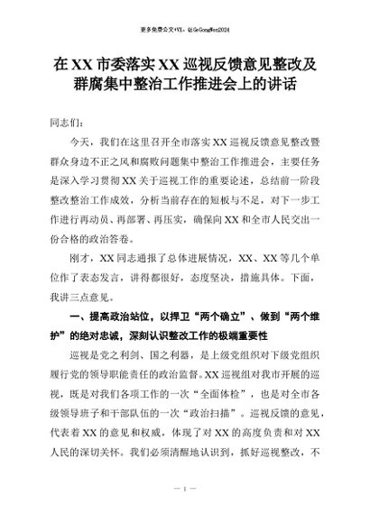 【七哥公文】2026年:在XX市委落实XX巡视反馈意见整改及群腐集中整治工作推进会上的讲话+更多免费公文+VX:QiGeGongWen2024
