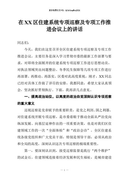【七哥公文】2026年:在XX区住建系统专项巡察及专项工作推进会议上的讲话+更多免费公文+VX:QiGeGongWen2024