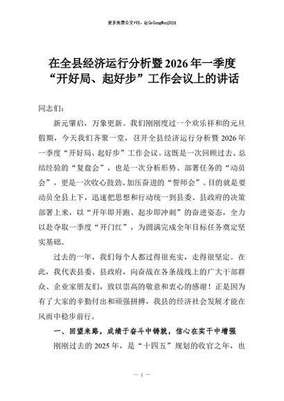 【七哥公文】2026年:在全县经济运行分析暨2026年一季度“开好局、起好步”工作会议上的讲话+更多免费公文+VX:QiGeGongWen2024