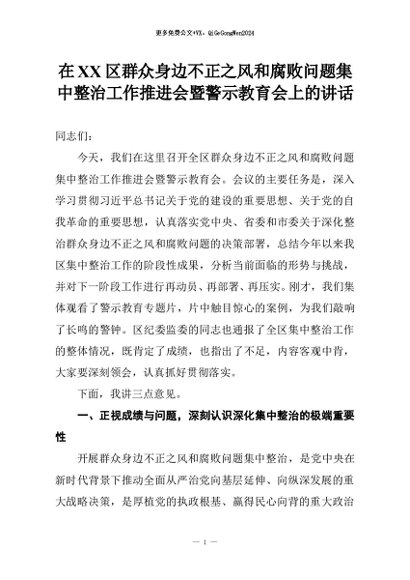 【七哥公文】2026年:在XX区群众身边不正之风和腐败问题集中整治工作推进会暨警示教育会上的讲话+更多免费公文+VX:QiGeGongWen2024
