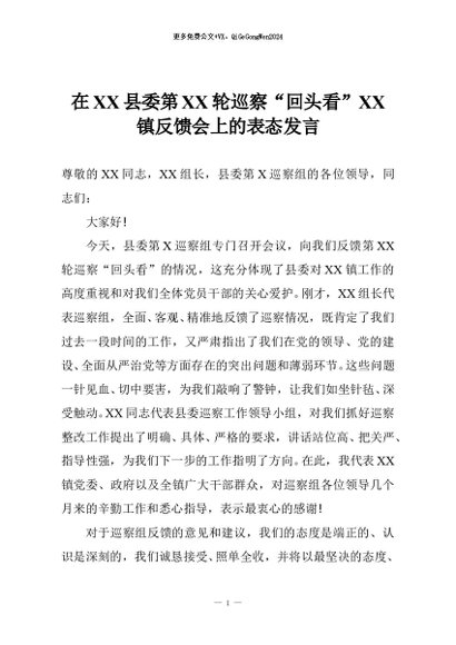 【七哥公文】2026年:在XX县委第XX轮巡察“回头看”XX镇反馈会上的表态发言+更多免费公文+VX:QiGeGongWen2024