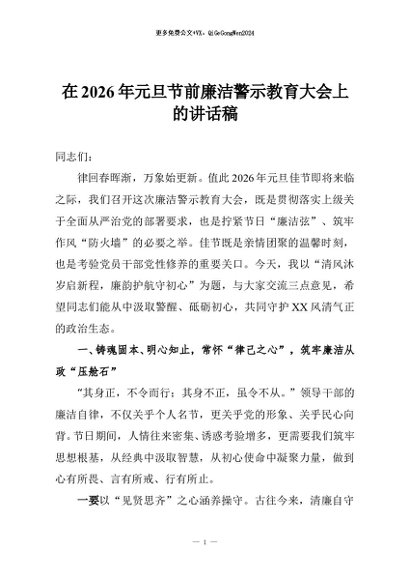 / 【七哥公文】2026年:在2026年元旦节前廉洁警示教育大会上的讲话稿+更多免费公文+VX:QiGeGongWen2024