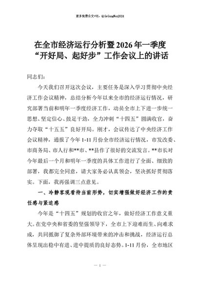 【七哥公文】2026年:在全市经济运行分析暨2026年一季度“开好局、起好步”工作会议上的讲话+更多免费公文+VX:QiGeGongWen2024