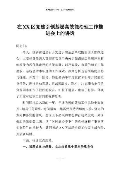 / 【七哥公文】2026年:在XX区党建引领基层高效能治理工作推进会上的讲话+更多免费公文+VX:QiGeGongWen2024
