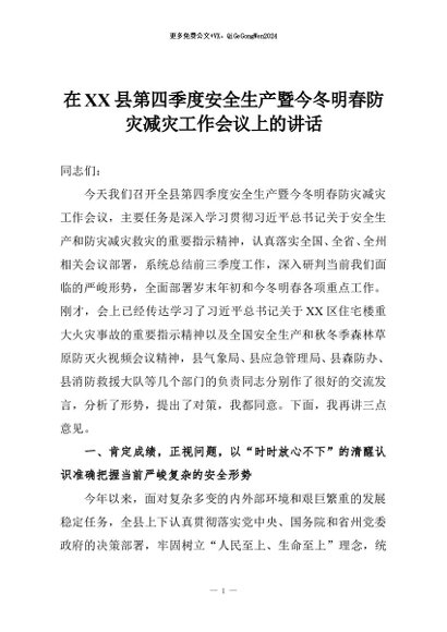 【七哥公文】2026年:在XX县第四季度安全生产暨今冬明春防灾减灾工作会议上的讲话+更多免费公文+VX:QiGeGongWen2024
