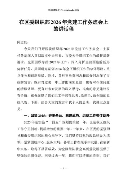 / 【七哥公文】2026年:在区委组织部2026年党建工作务虚会上的讲话稿+更多免费公文+VX:QiGeGongWen2024