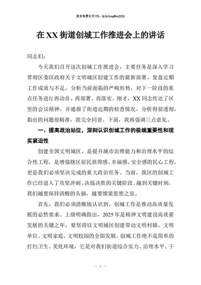 【七哥公文】2026年:在XX街道创城工作推进会上的讲话+更多免费公文+VX:QiGeGongWen2024