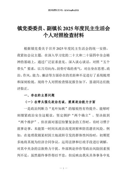 【七哥公文】2026年:镇党委委员、副镇长2025年度民主生活会个人对照检查材料_副本+更多免费公文+VX:QiGeGongWen2024