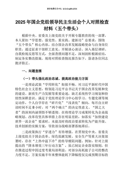 【七哥公文】2026年:2025年国企党组领导民主生活会个人对照检查材料(五个带头)+更多免费公文+VX:QiGeGongWen2024