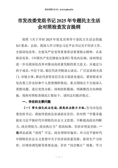 【七哥公文】2026年:市发改委党组书记2025年专题民主生活会对照检查发言提纲_副本+更多免费公文+VX:QiGeGongWen2024
